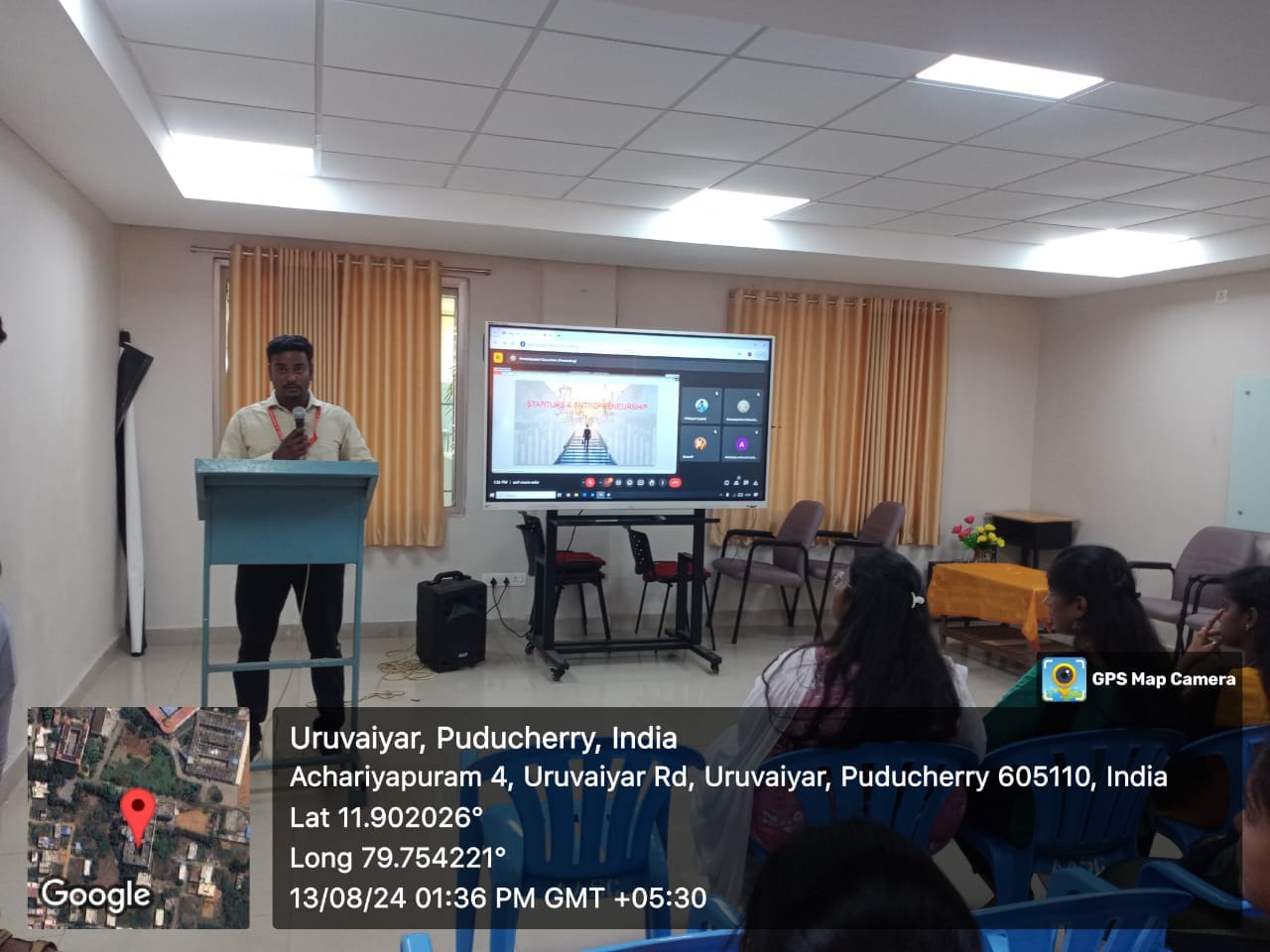The Guest Lecture was delivered by *Ms. G. Kowsalyadevi, MIB, M.Phil, (Ph.D.), Innovation Ambassador, and Assistant Professor, Department of Commerce PA, KG College of Arts and Science, Coimbatore* . Her insightful lecture provided a comprehensive overview of startups and offered valuable advice on improving entrepreneurial skills. She also discussed the financial assistance available from the government for young and aspiring entrepreneurs.