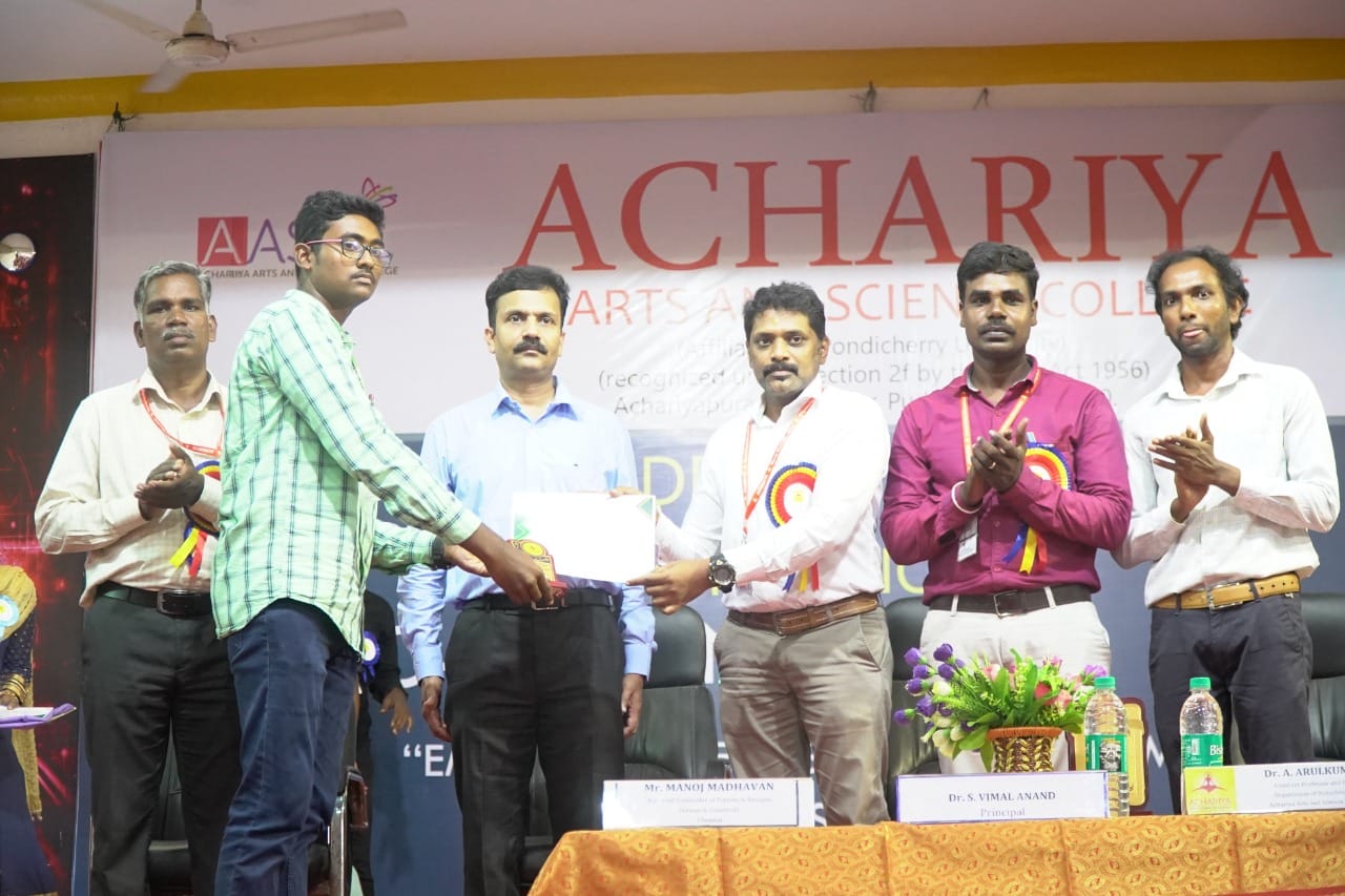 Esteemed principal of Achariya Arts and Science College, Dr. S. Vimal Anand sir shared a special valedictory note with the august audience during the valedictory session and wholeheartedly accoladed the faculty members and students of the department of biotechnology. A pledge to save mother nature has also been taken by all the participants to display the importance of nature. The best presentations were awarded certificates and mementos during the valedictory function. Dr. Sivaranjani. G, Assistant Professor of the department of Biotechnology proposed the gratitude note and thanked all the audience for their presence. Feedback forms for all the lecture sessions were collected at the end of every session from every participant and delegate. Students of Biotechnology showcased their talents through different art forms to the delegates and dignitaries and entertained the crowd affirmatively. The two days national seminar ended with National Anthem.